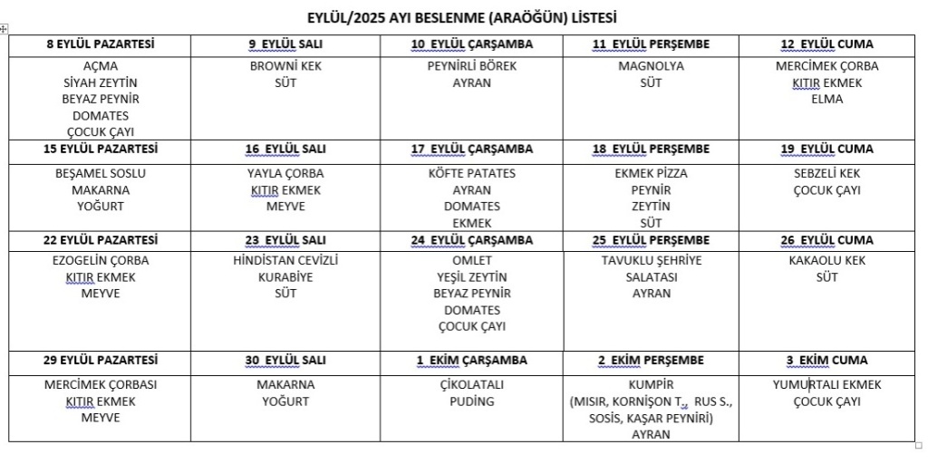 2025/EYLÜL AYI ARAÖĞÜN BESLENME LİSTEMİZ...
