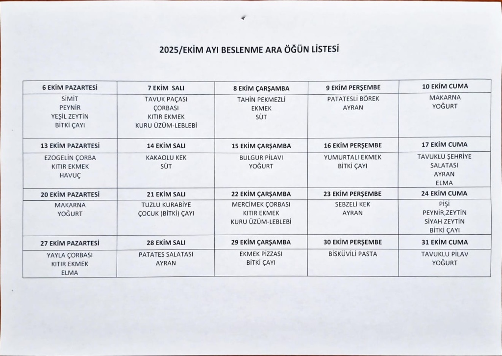 EKİM AYI BESLENME(ARA ÖĞÜN) LİSTESİ YAYINLANDI.